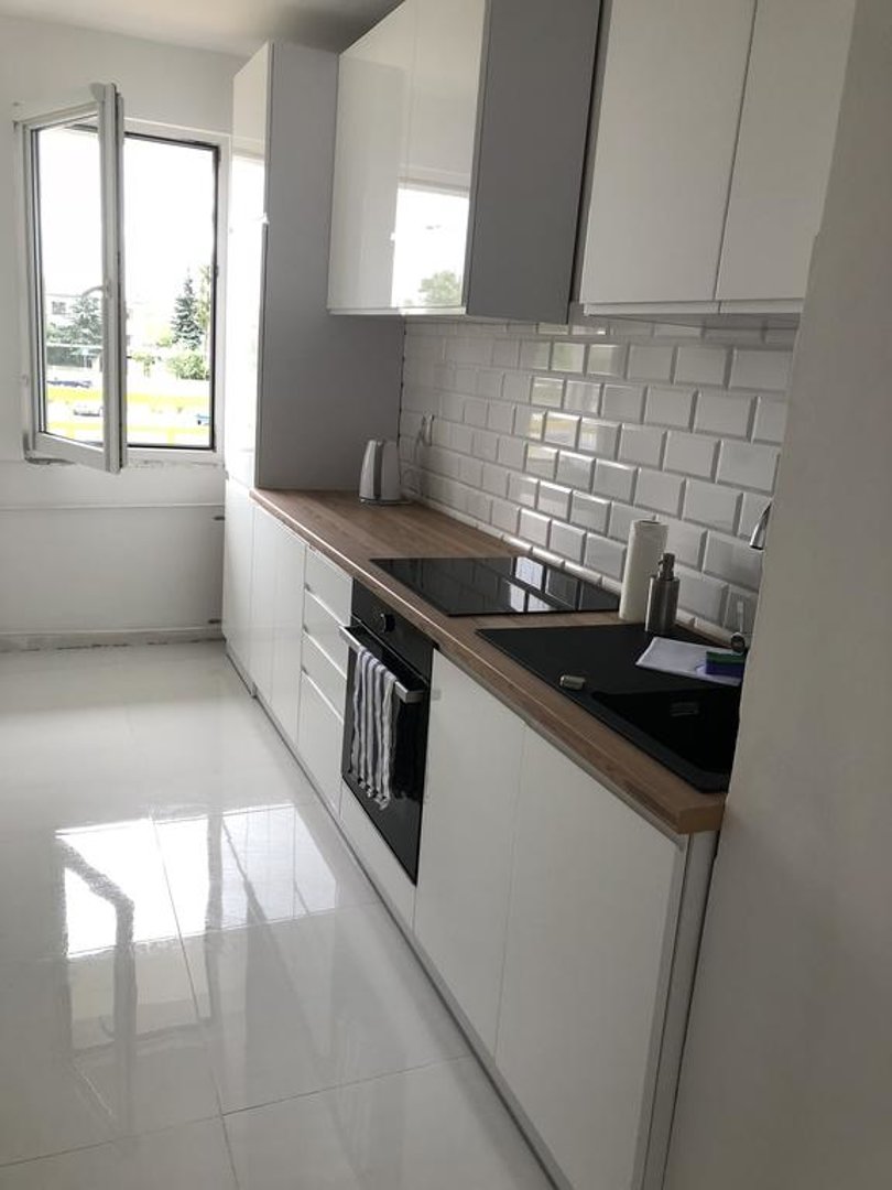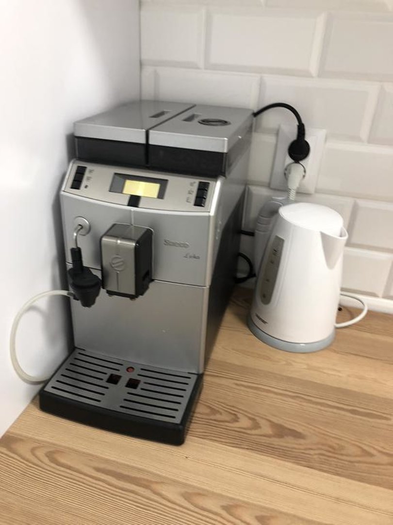 Ten apartament dysponuje kuchnią z przyborami kuchennymi. Podłoga wyłożona jest kafelkami lub marmurem.